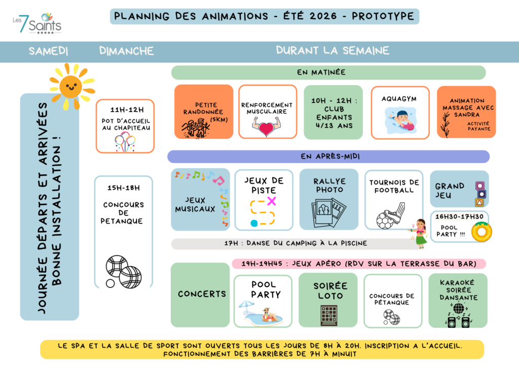 Note : Ce planning est un prototype donné à titre indicatif pour vous donner une idée de l’ambiance. Le programme définitif sera affiché à votre arrivée !